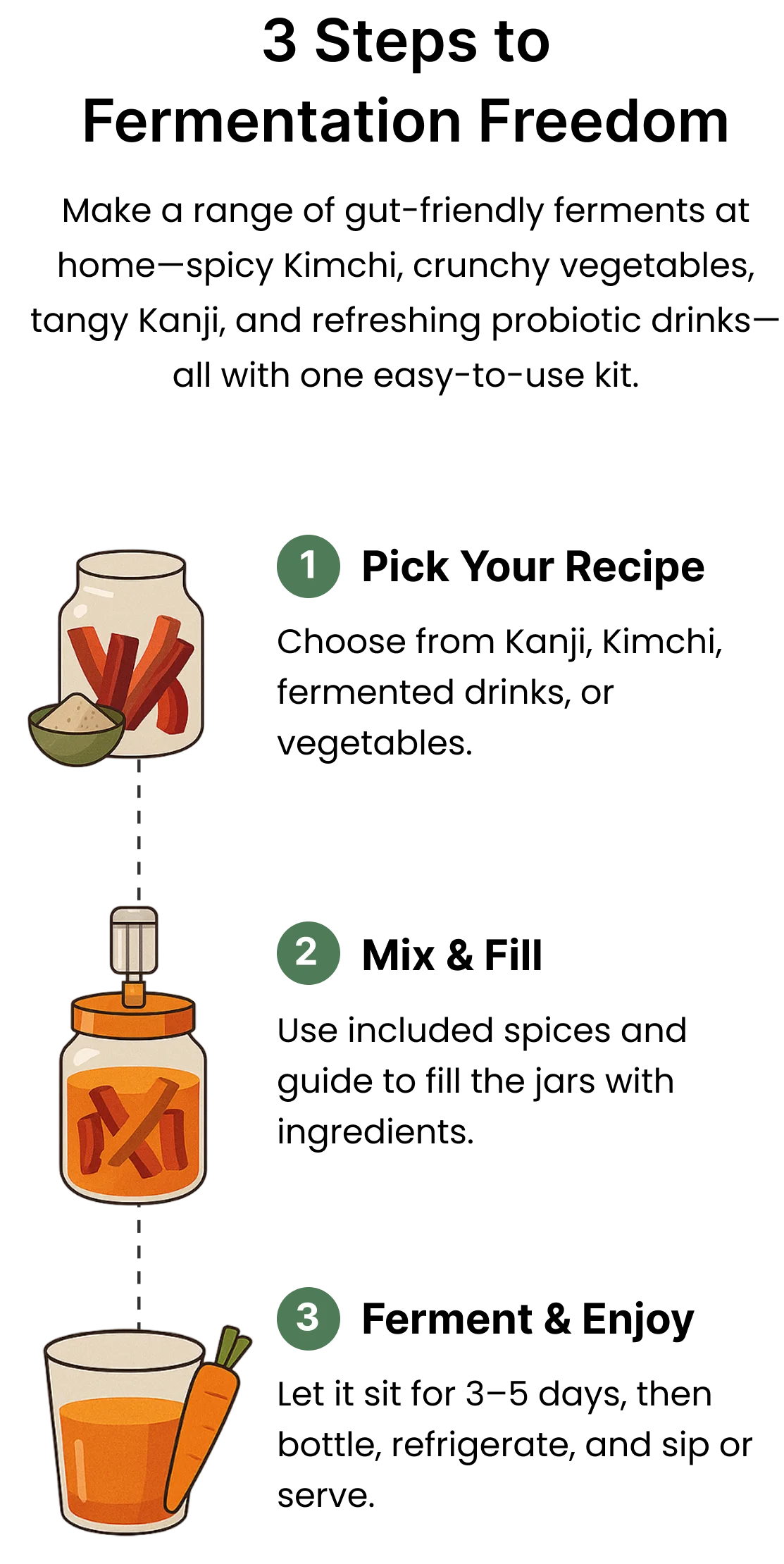 Choose from Kanji, Kimchi, fermented drinks, or vegetables.