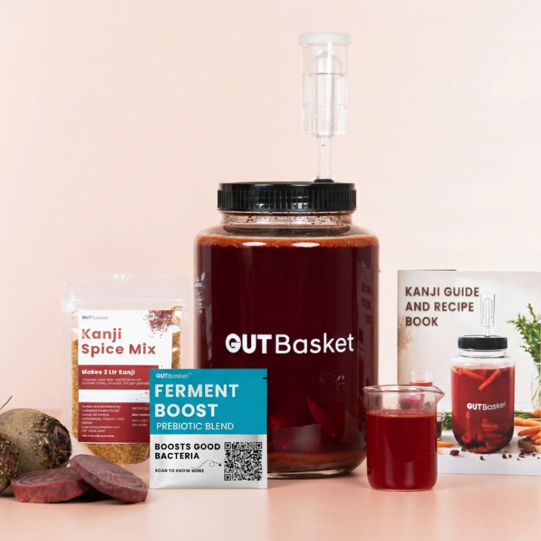 Ferment the tangy, probiotic-rich Indian drink at home—without the mess, guesswork, or mold.The Gut Basket Kanji Making Kit is your all-in-one, beginner-friendly system to brew authentic wild-fermented kanji—a traditional Indian probiotic drink made with carrots, beets, mustard, and salt. Powered by natural lactic acid fermentation and protected with an airlock lid system, this kit ensures a safe, hygienic, and successful ferment every time.Whether you’re tackling bloating, skin issues, or looking to ditch dairy-based probiotics, kanji is your gut’s natural solution—cooling, detoxifying, and completely vegan.